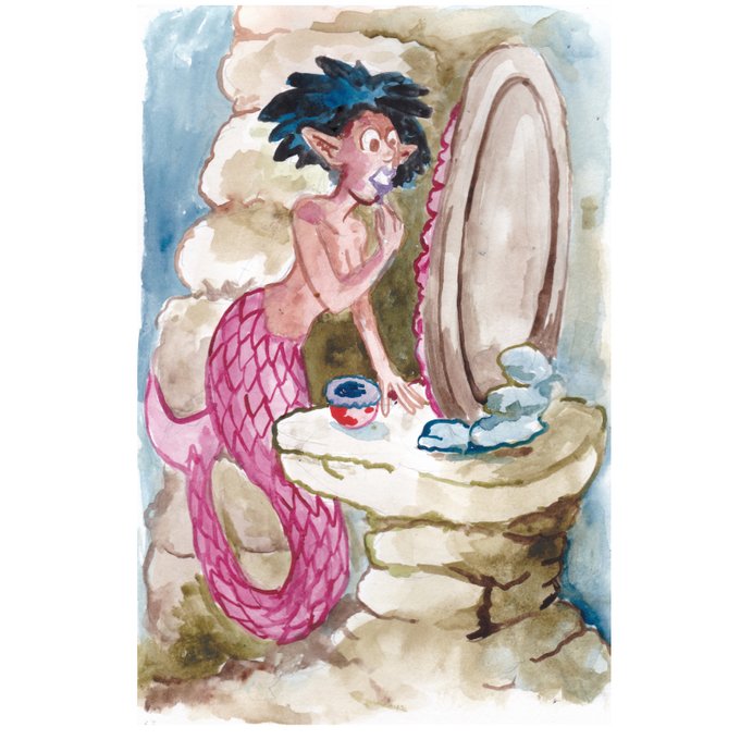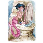 On Day Three of #mermay2022 - A #mermaid tries her big #sister's #Glossy #Lipstick. #illustration #watercolor #watercolorpainting #painting #mermay #Makeup #boudoir #mermaidscave #mirror #MermaidIllustration #Mermaidart #mermaids