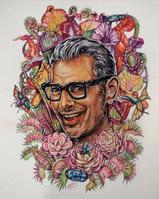 Reposting this #watercolorpainting of Jeff #Goldblum with carnivorous plants because I'm proud of it, gosh darn it.