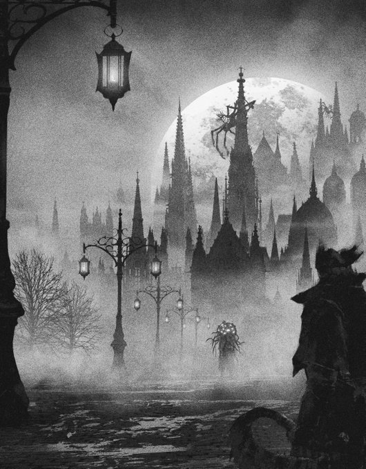 An Insightful Encounter (Alternate version)💀 Think I prefer this version to the original. The shift to black & white combined with copious amounts of grain/ noise makes the piece look more disturbing and creepy #bloodborne #darkfatasy #fanart #gothicart