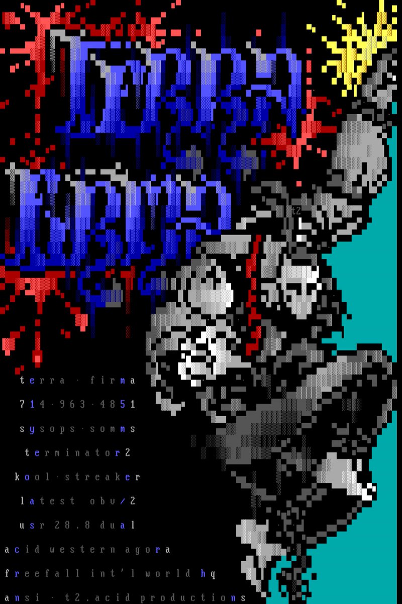 “Terra Firma” Small scale #Pitt #ANSI by Terminator2 // ACiD (1994) #ansiart #ascii #asciiart #pixelart #textmode #textart #text #art #demoscene #bbs #retrocomputing #retrographics #8bit #typography #graffiti #graffitiart #imagecomics #image30thanniversary #comics #comicbookart