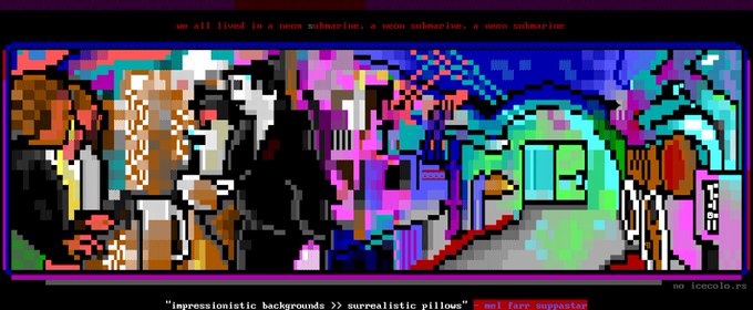 “vampire mixing drinks in a sub” ANSI by Mel Farr Suppastar // Lazarus (2021) Check it: 16colo.rs/pack/laz14 #ansiart #ansi #ascii #asciiart #pixelart #textmode #textart #art #demoscene #bbs #retrocomputing #retrographics #8bit #8bitart #typography #graffiti #graffitiart