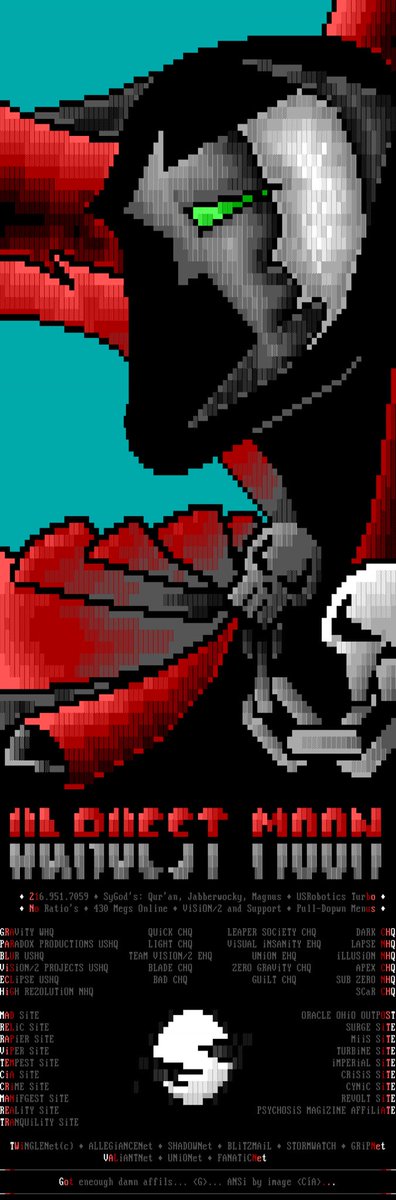 HARVEST MOON —- #Spawn #ANSI by Image // CiA (1994) #ansiart #ascii #asciiart #pixelart #textmode #textart #text #art #demoscene #bbs #retrocomputing #retrographics #8bit #8bitart #graffiti #graffitiart #imagecomics #image30thanniversary #comics #comicbookart #toddmcfarlane