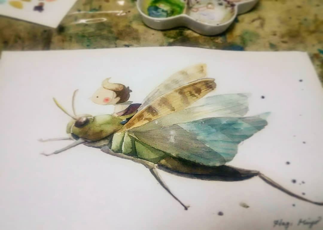 Watercolour version Day 8 of the #SummerBuggin July Bugtastic Bonanza challenge with @caseybella3 & @artyreg77 Today is the Grasshopper Happy Friday! 💞💖🐛🐝🦟🦗🐜🐞🦋🐌 #bugtastic #bugart #insectart #julyartchallenge #insects #bugs #fly #grasshopper #flowers