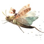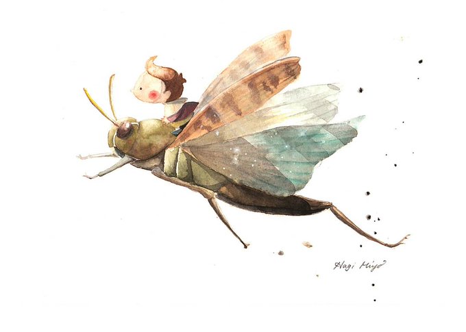 Chubby Boy and Grasshopper "Let's go to the grassy plain together." リクエストに応えて虫の絵を。精霊飛蝗さえ触れない私には描きながら鳥肌がたってしまいました笑。良い刺激に。#illustration #watercolor #イラスト #水彩 #ムチムチムチboy #grasshopper #バッタ