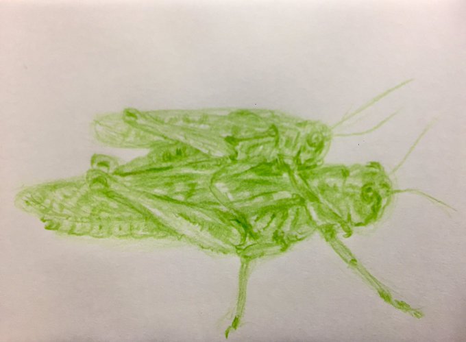 🍀今日の生きもの🍀 雌におんぶされてる雄のトノサマバッタ。どんなに追っかけても落ちない。大人になるまでずっと親子だと思ってました😹 #トノサマバッタ #虫 #locust #grasshopper #動物好きな人と繋がりたい #色鉛筆 #イロエンピツ #スケッチ #coloredpencil #sketch #絵描きさんと繋がりたい