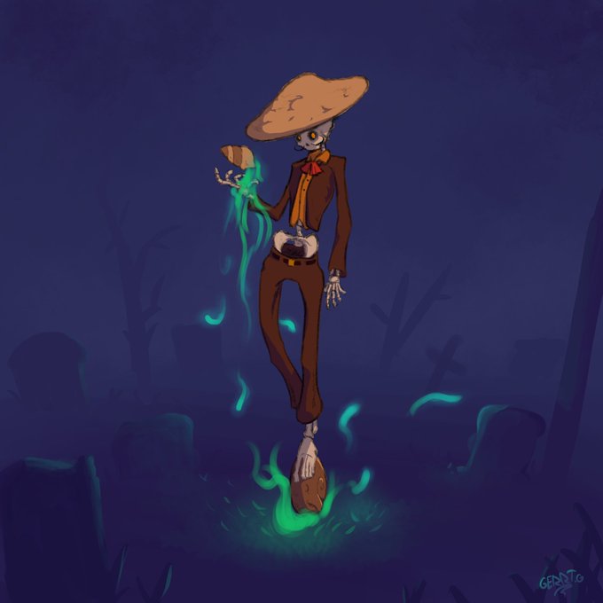 Pour les 2 ans de stream de @RFrauhn j'ai fait un champignon squelette mariachi dans un cimetière capable de libérer des esprits enfermé dans des coquilles d'escargot #mushroom #squeleton #spirit #snail #graveyard #art #drawing #digitalart #digitalpainting #painting #krita