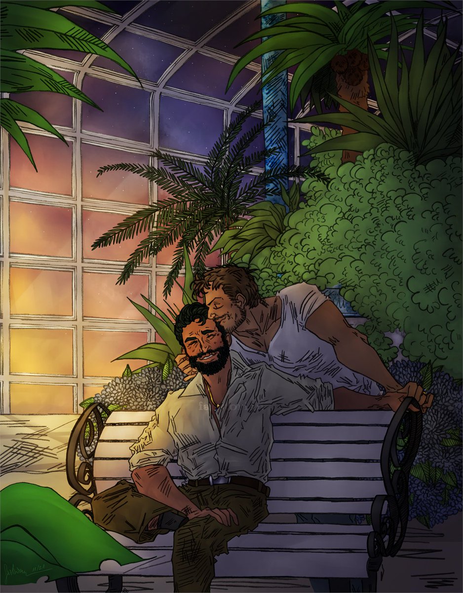 Commission piece for @writerinafoxhole that I finished recently, featuring their & their friend’s OC, being all lovey-dovey 💕 We absolutely love to see it~ Thank you for the opportunity to work with you again! 💙 #illustration #romance #greenhouse