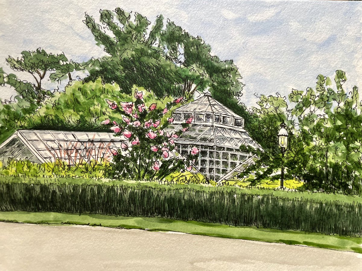 The Greenhouse and crepe myrtle at @SnugHarborCCBG. #art #ink #watercolor #landscape #garden #crepemyrtle #greenhouse #StatenIsland