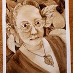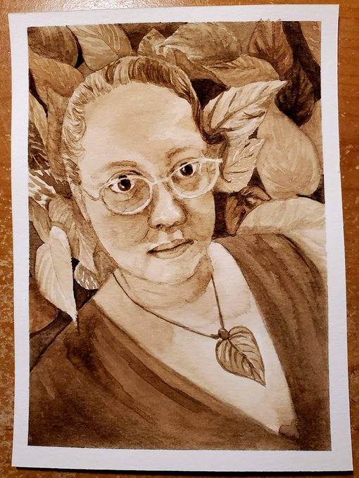 I've been painting (almost) daily for #WitchTober using black walnut ink I made myself! This is a #selfportrait I created for the prompt #GreenWitch. Portraying "green" using a brown #ink is HARD!!! twitter.com/lunae_dies/sta…