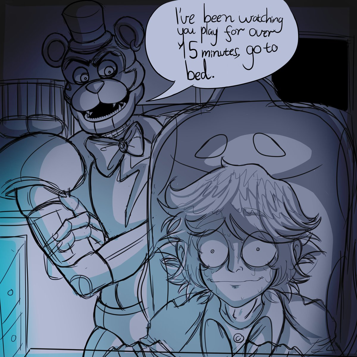 Gregory getting caught playing games late at night. (sketch) #fnafsecuritybreach #fnaf #fnaffanart #fivenightsatfreddys #glamrockfreddy #gregory