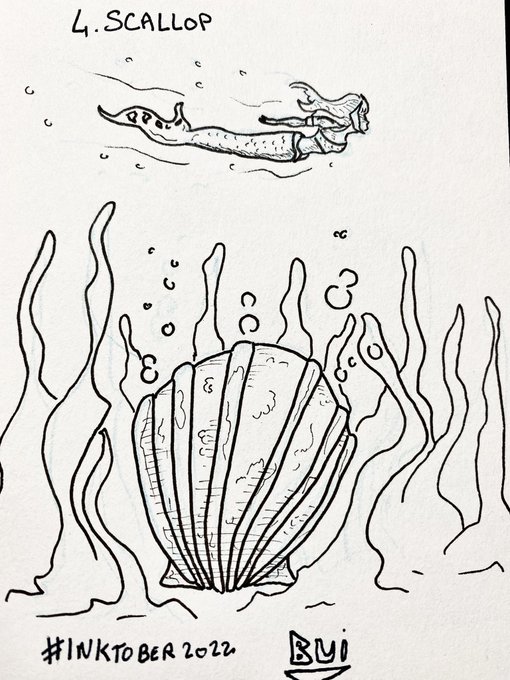 Inktober 2022, day 4: Scallop Avec Syrin. #inktober #inktober2022 #day4 #scallop #dailychallenge #drawing #art #gregorybui #originalcharacter #creatorowned #lesprotecteurs #syrin #mermaid #unipin
