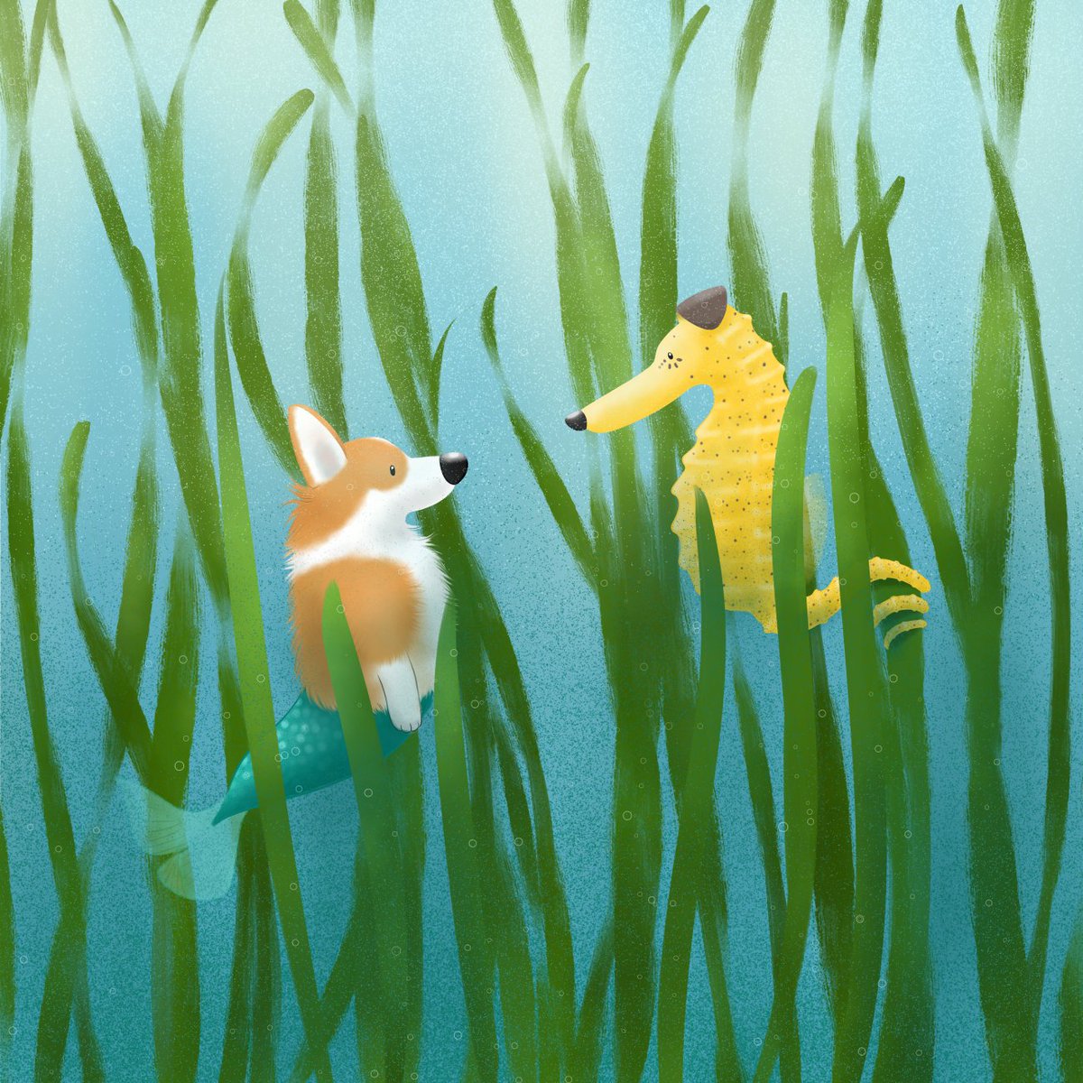 It's #mermay, which means mercorgs! Mercorg meets a seanoodlehorse. #corgi #greyhound #colour_collective