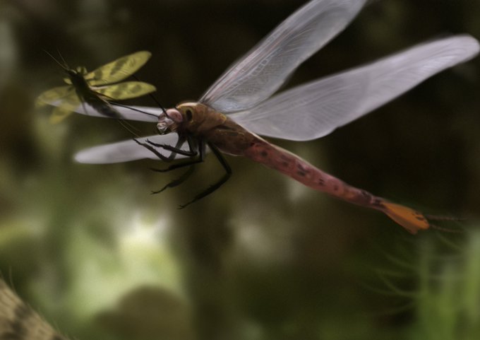 Another carboniferous painting, going for something more stylized this time #art #digitalart #illustration #insect #paleoart #carboniferous #meganeura #griffinfly #lepidodendron #scaletrees #clubmosses #paleozoic #Palaeozoic