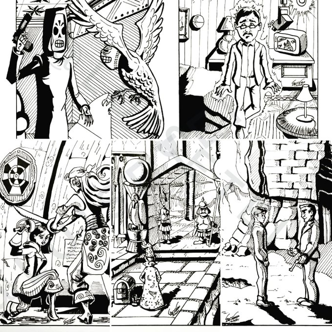 Sexto y último set de Inktobers. Te gustaría ver alguno de ellos en color? Mencioname y dime cuál! #Inktober #art #illustration #aventuras #pointandclick #brokensword #grimfandango #indianajones #toonstruck