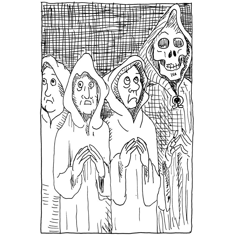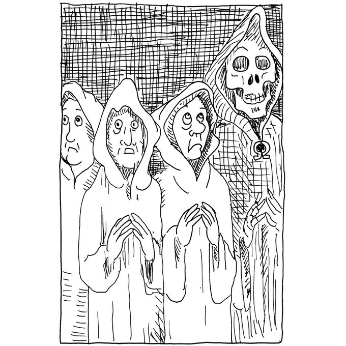 In today's #Discworld #Illustration, The #ElucidatedBrethren sense that something is not right. #fantasy #guardsguards #citywatch #TerryPratchett #Death #secretsociety #robes #PenandInk #seattleillustrator