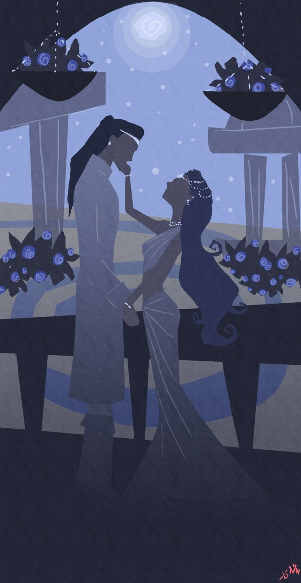 A bit of #dnd #romance. My main PC Tulia falls in love with her then-fiance (now husband) Erik Sabarra. #dungeonsanddragons #dnd5e #dndart #dndcharacter #paladin #gunslinger #ball #night #love