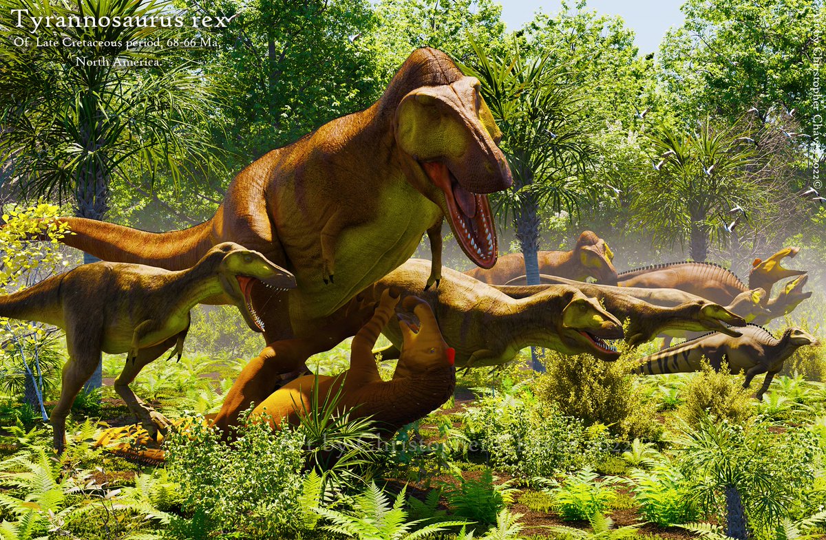A group of tyrannosaurus rex hunts down a herd of Edmontosaurus annectens on their migratory path. #tyrannosaurusrex #tyrannosaurus #dinosaur #paleoart #hadrosaurid #Edmontosaurus #paleontology #hadrosaurus