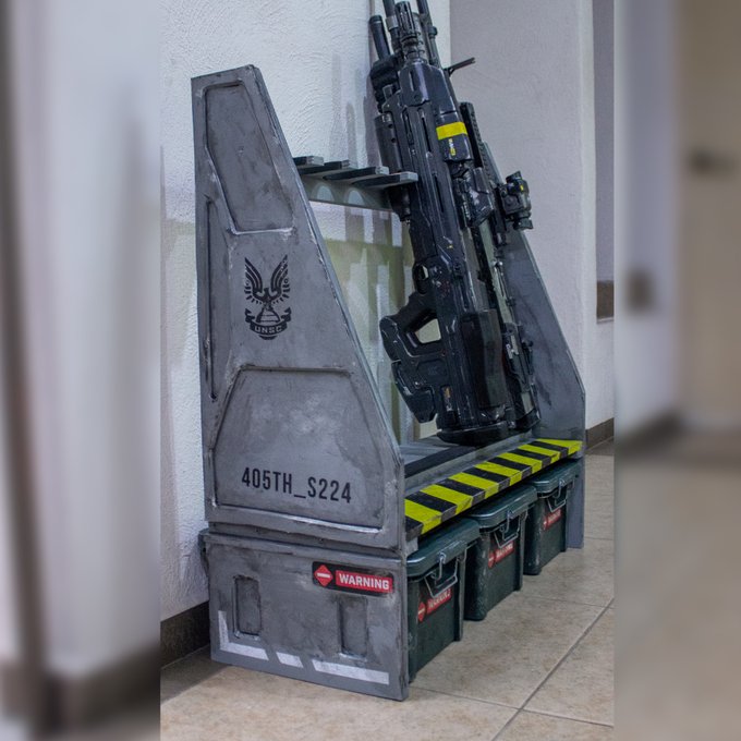 #HaloInfinte inspired weapons rack to display my Halo props. It's made out of 12mm triplay, and the details with 6mm eva foam #Halo #HaloProps #HaloCosplay #HaloSpotlight #UNSC