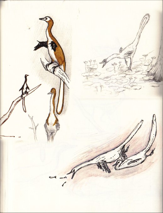 Some sketches done today, #Halszkaraptor perching, stalking on water plants and hunting underwater. All done without reference so mistakes were made. #paleoart