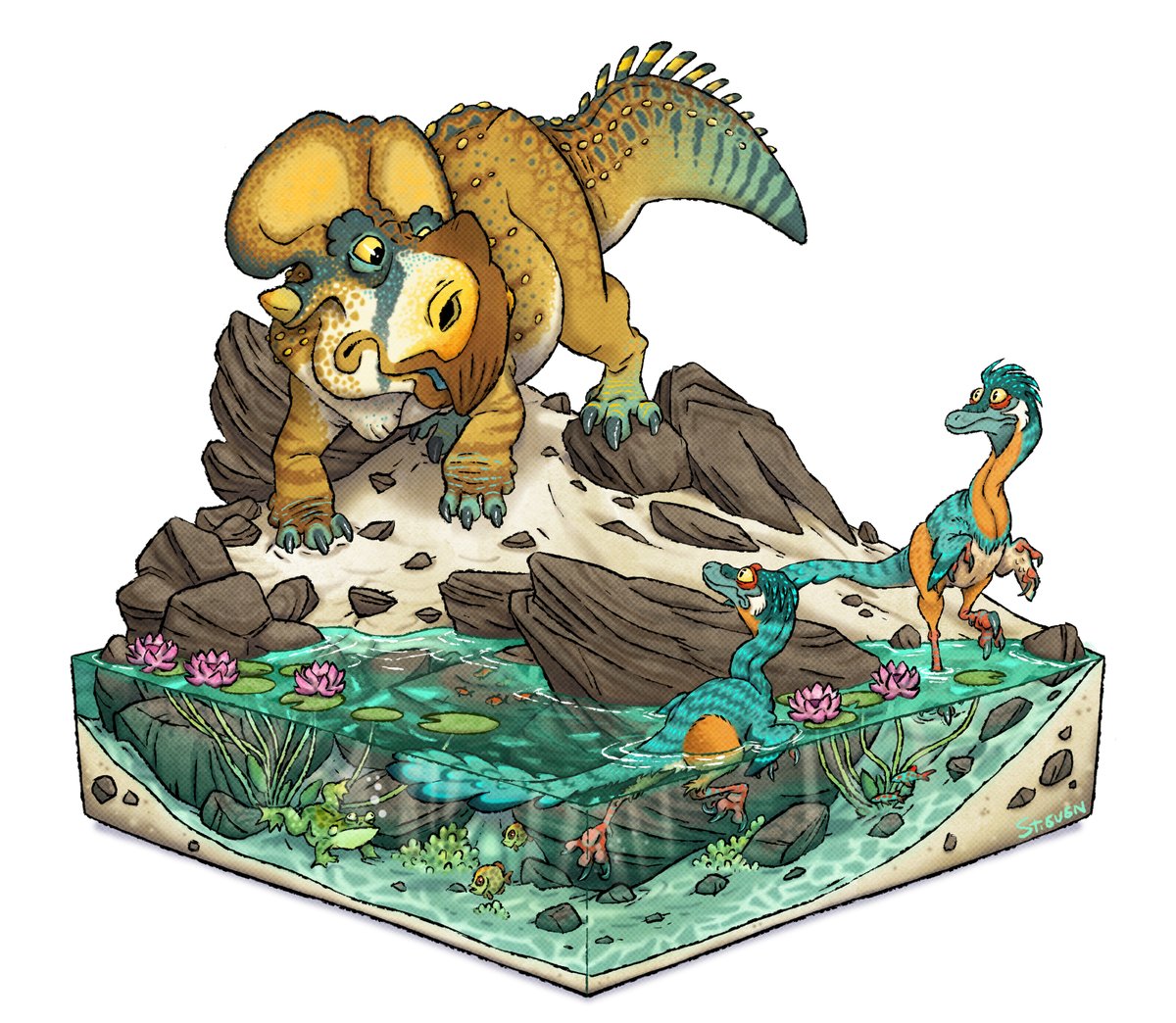 HALSZKARAPTOR ESCUILLEI. The desert is blossoming! This Halszkaraptor is chilling on the tip of a rock, in a pond formed after the recent showers 🌧️ Life is uh... finding a way in ancient Djadochta 🌼🌱 #paleoart #dromeosauridae #halszkaraptor