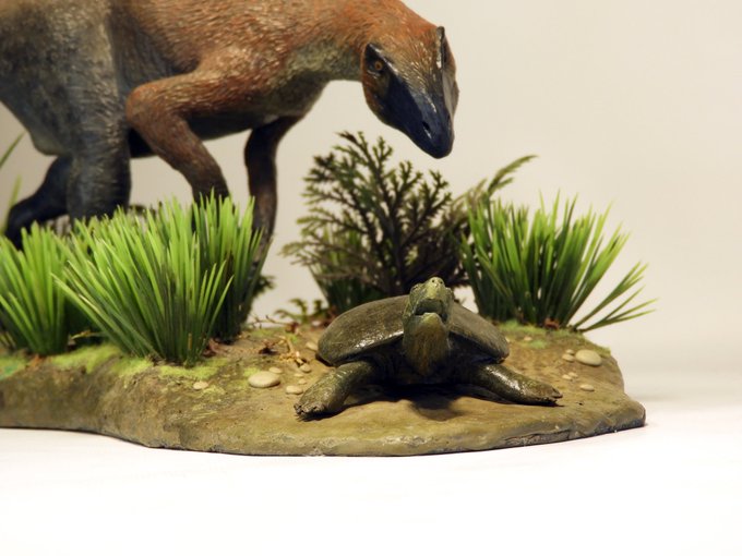 A curious and maybe hungry #Santanaraptor is stalking a tortoise that's in a hurry to return to water. Epoxy clay and artificial plants #paleoarte #paleoart #dinossauro #dinosaurio #dinosaur #handsculpted #handmade #handpainted #brazil #brasil #cretaceous #cretacico #mesozoic
