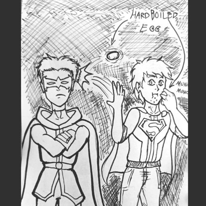 #Batober Day 10, #hardboiled. Hardest word of the challenge till now. And another great excuse to bring out the #SuperSons and 2 hardboiled eggs. #inktober2021 #fanart #supersons #robin #superboy #damianwayne #jonathankent #eggs #dccomics instagr.am/p/CU-r0MbJnuA/