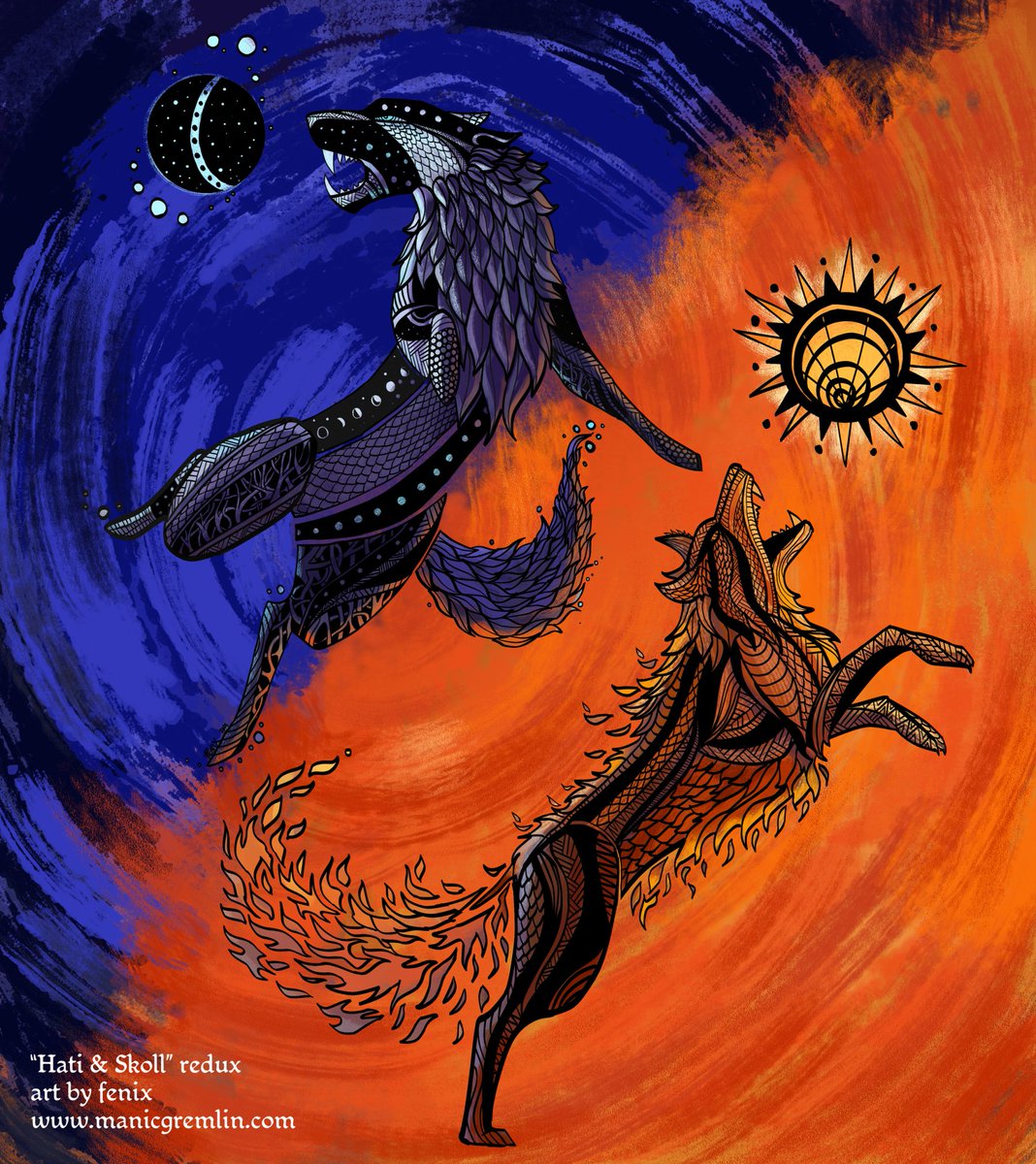 Hati & Skoll redux: this is an updated version of an older piece from 2019 where i was just going to tweak anatomy/some of the lineart and then ended up painting a whole new piece 😂 #art #illustration #norse #mythology #ClipStudioPaint #wolves #hatiandskoll #ragnarok