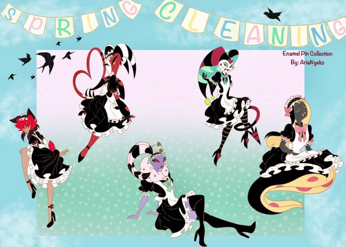 ✨Interest Check✨ Spring Cleaning Maid Pin-Up Pins~ Interested in these cuties~? 😘💕 . . #HazbinHotel #HazbinHotelFanart #HazbinHotelAlastor #HelluvaBoss #hazbinhotelmerch #alastor #Blitzo #Fizzarolli #Valentino