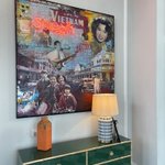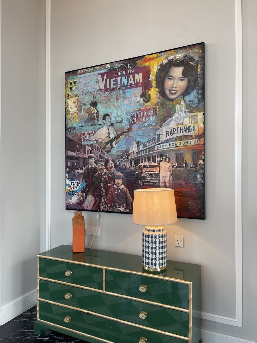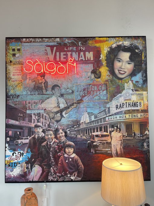Here, my last painting for the Mia Saigon Luxury Boutique Hotel, Gin-on-8 rooftop, a vintage composition, owner of the Mia Hotel in 150x150 cm on a steel sheet with neon Saigon. #saigon #saigonese #hcmc #artvsartist2021 #oilpainting