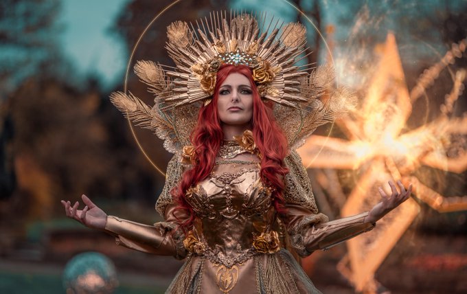 Ein bisschen Sonne fürs Wochenende ☀️ 📸 terobes Arts #cosplay #costume #owndesign #owncostume #sun #sungown #goddess #photoshooting #fantasy #gold #bling #crown #headpiece #halo #armour #worbla #magicmoments