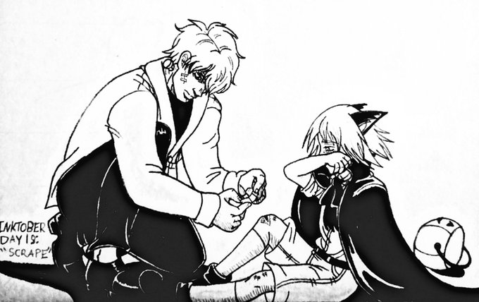 #Inktober day 18: "#scrape" . For this prompt it made me think of scraped knees, and then reminded me of the werewolf captain and his first aid kit. So here's a wholesome #HellsingUltimate #fanart of Hans and Schrodinger in #Halloween costumes going trick or treating. #Hellsing