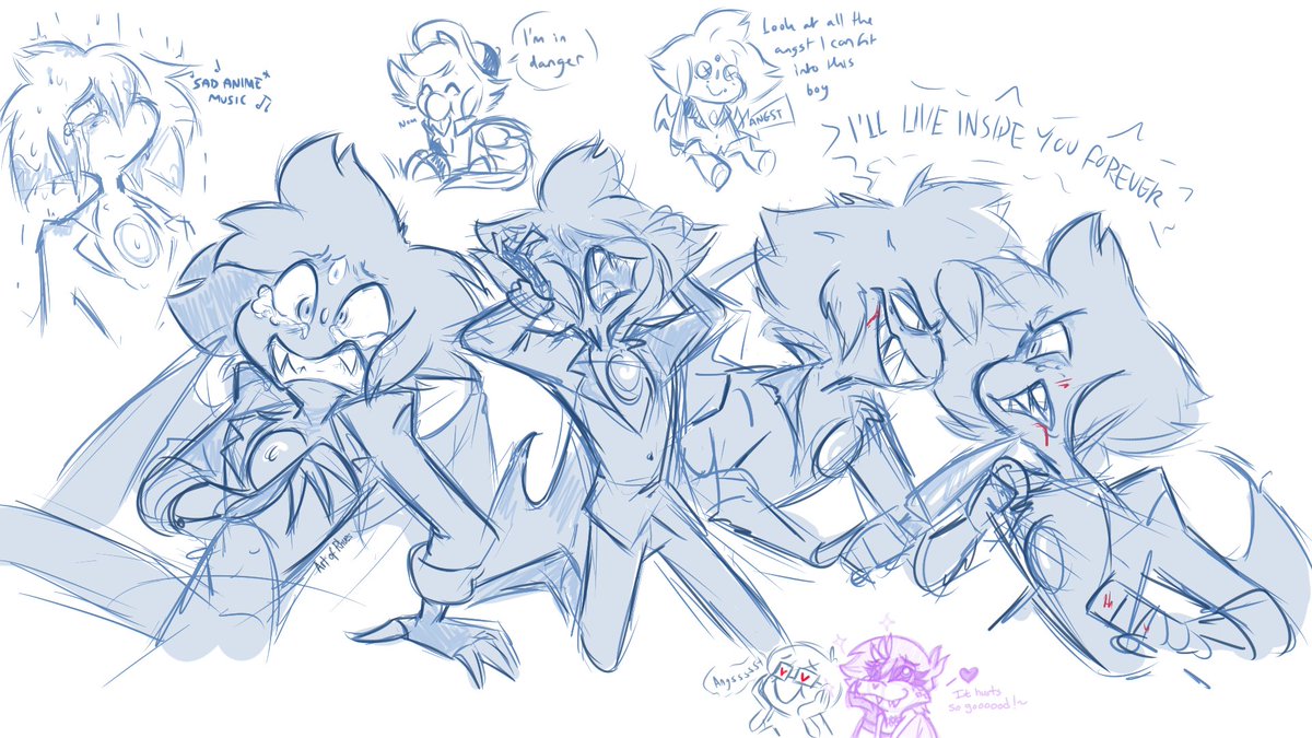 Some angsty little doodles featuring @KalookiC's precious boi, Finn, and a little doodle from the lady herself in purple along the bottom... I do like making this poor lad suffer...But I have permission so no one can stop me! 😈 #HazbinHotelFanart #hellsona #FinneganK #artofrhues
