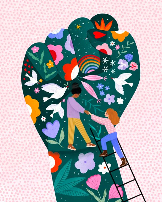 "We all benefit by reaching out and helping others." ~ Les Brown Wonderful #illustration by Bea Müller, represented by @brightillo. Explore her portfolio: buff.ly/3RvsvVv #LeadwithEquity #equity #equality #helpingothers #bekind #bettertogether #pattern #floral #kidart
