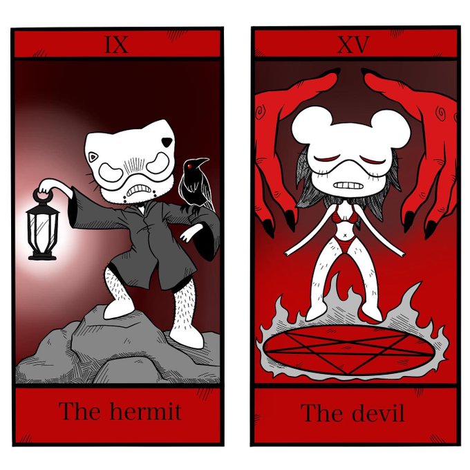 Day 19: Card Game 🃏♠️♥️ The hermit and The devil from Tarot 🃏Do you know how to use Tarot cards? #catandmousetober2022 #catandmouse #catandmousecomics #artist #inktober #tarot #hermit #devil #cardgame #cards