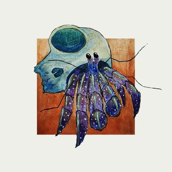 "a hermit on a hermit" idk i was thinking maybe there's a whole bunch of tiny beings who live on hermit crabs and each hermit crab shell has its own different space, so they swap houses the same way hermit crabs swap shells. #watercolor #hermitcrab #art