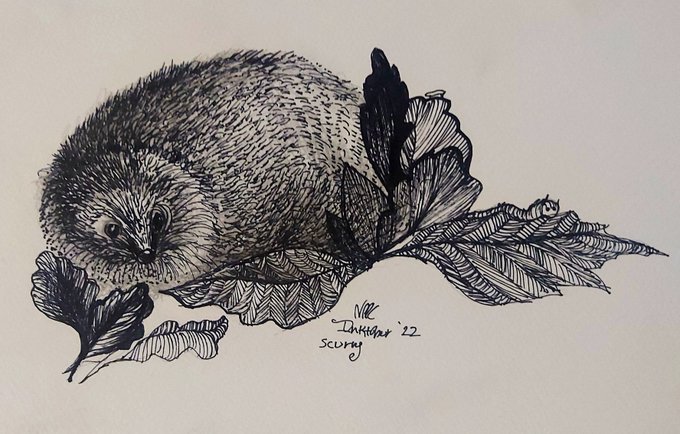 Inktober 2022 Day 2 Prompt Scurry Hedgehogs are good runners, proficient climbers and can even swim. In the autumn they find a sheltered spot, often under a hedgerow, to hibernate. Drawn with inks and pencil #inktober2022scurry #hedgehog #hibernate #inktober #inktober2022