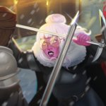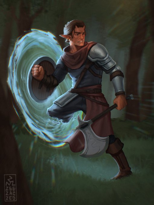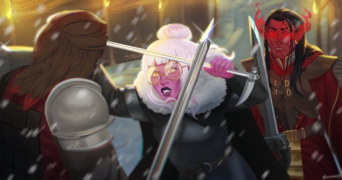 Three-way fight commission by @mc_much! Thank you so much again! The characters from left to right, in order: Pox (Human fighter), Pragma (Aasimar fighter/warlock), Idacey (Hobgoblin wizard). #dndart #dungeonsanddragons #aasimar #hobgoblin