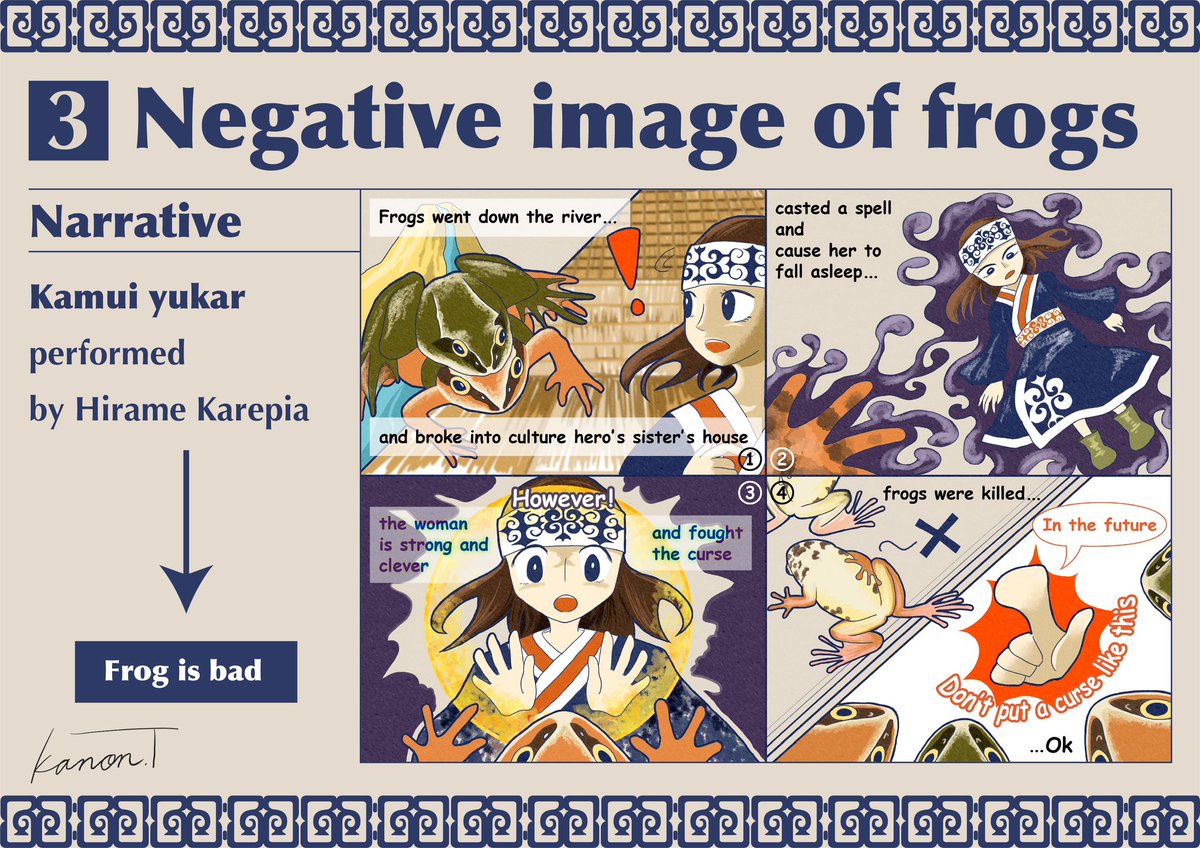 「アイヌにとってのカエルとは」 パリ自然史博物館での発表で使用したスライドです アイヌにとってカエルがマイナスなイメージで描かれている物語と、プラスなイメージで描かれている物語があります! #manga #illustration #science #ainu #hokkaido #frog #イラスト #イラストレーション