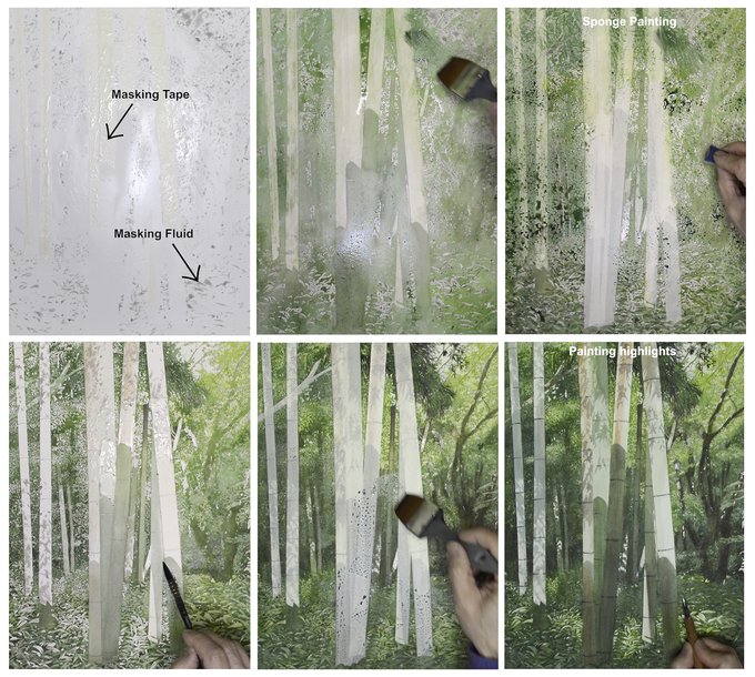 竹林の木漏れ日。マスキングを使った緑と光の描き方 How to paint youtu.be/0JZYl0Mq4PY #水彩メイキング #making #howtopaint #watercolor #水彩画