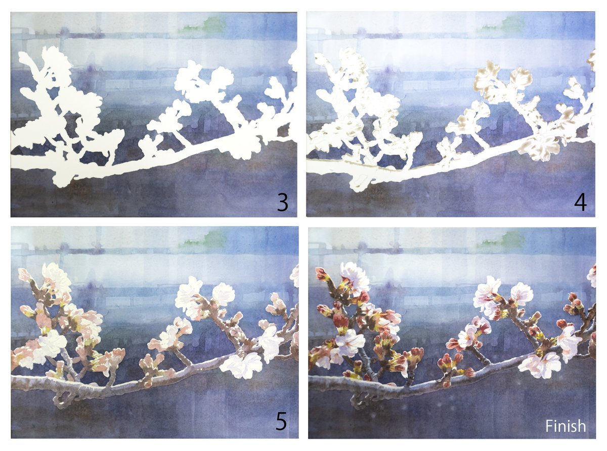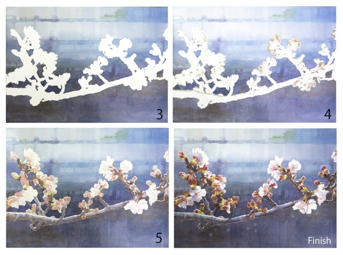 [SAKURA] Watercolor Step by Step 水彩画の工程 3.マスキング液除去 4.ハイライトをマスキングする 5.着彩後マスキング除去 Finish.着彩して完成 #watercolor #水彩画 #描き方 #howtopaint