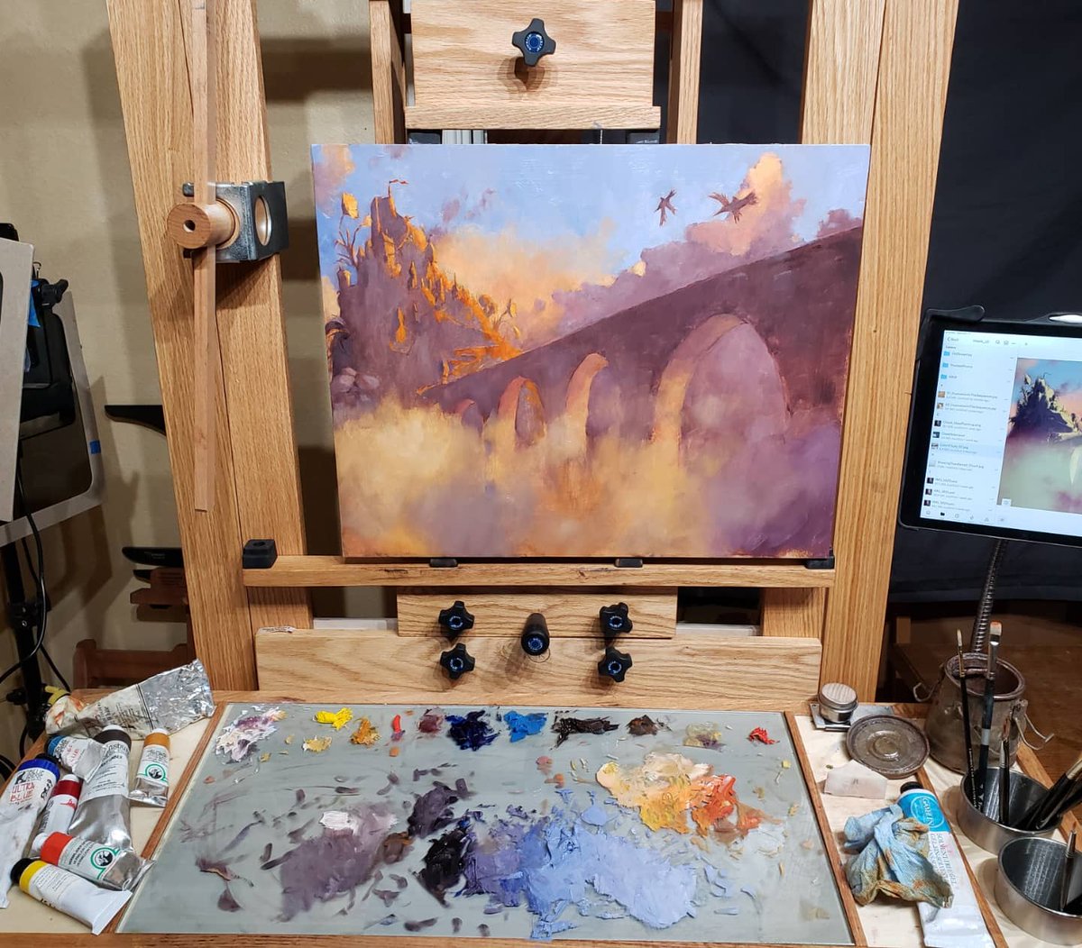 Working into color! #oilpainting #fantasyart #hummingbirds #clouds #gardenclan #thegoblintwins #wip