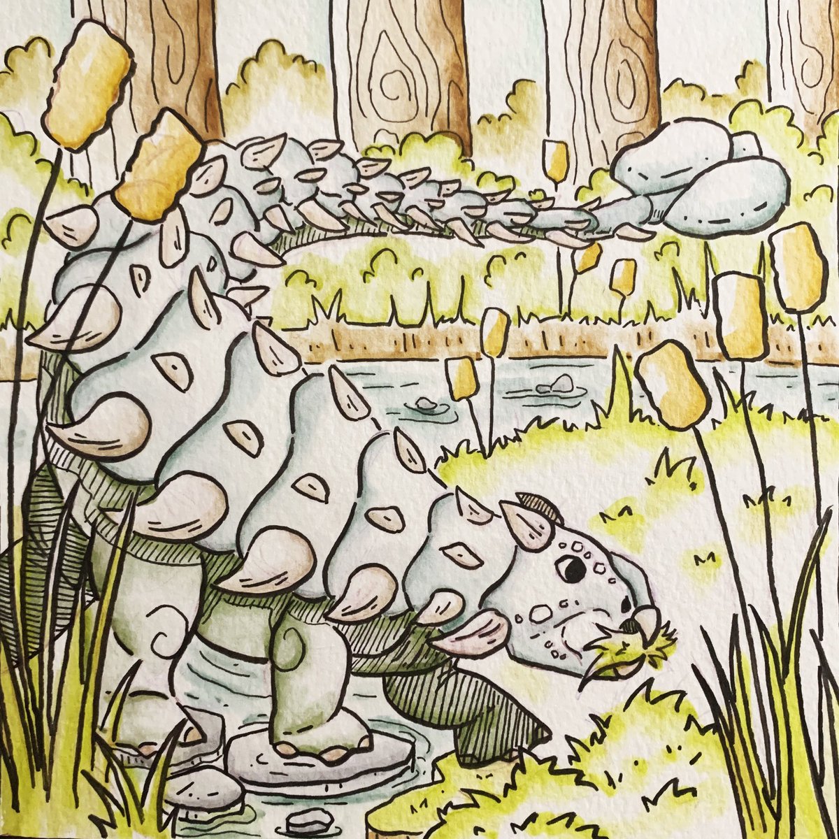 Day 4: Scallop. Today we have a popular fan favorite, ankylosaurus! Known of course for the scalloped shaped plates down its back. #inktober #inktober2022 #paleoart #illistration #dinosaur