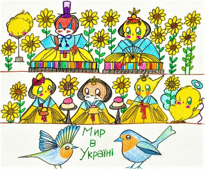#illstration #Ukraine #雛祭り #StopWar #ウクライナに平和を スズメ組のメンバーひな人形に🎎 ウクライナカラーのひな人形、ウクライナの花ヒマワリ、国鳥のコマドリを描きました 一刻も早くロシアが撤退して、ウクライナが平和になりますように🕊✝