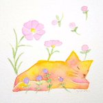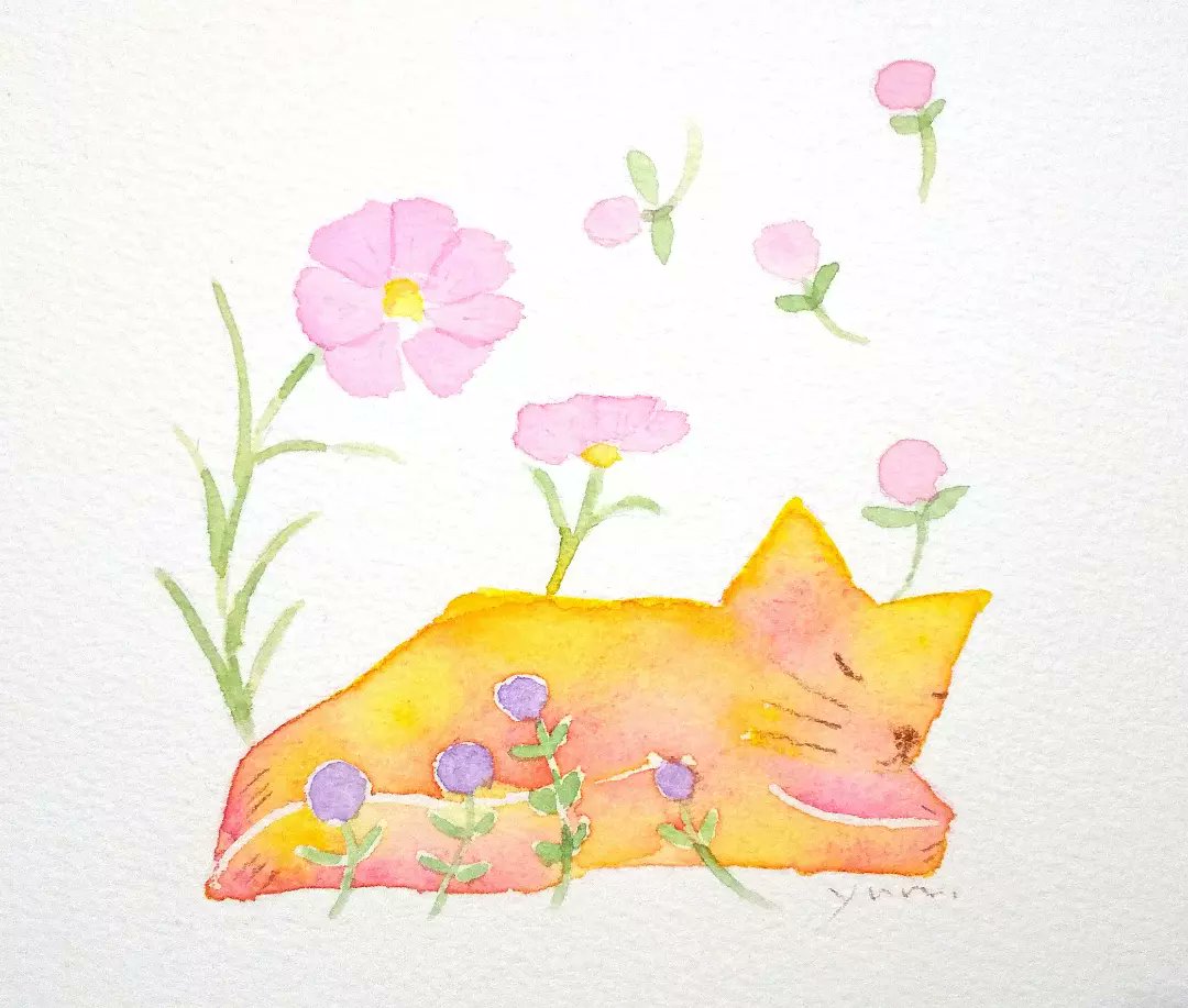 「秋の気配」 朝晩少し涼しくなって ほっとします #illstrations #animal #animalillustrator #animallover #flowerillustration #catillustration #ゆるいイラスト #イラストレーション #イラスト #挿絵 #挿絵イラスト #動物イラスト #動物 #ねこ #コスモス