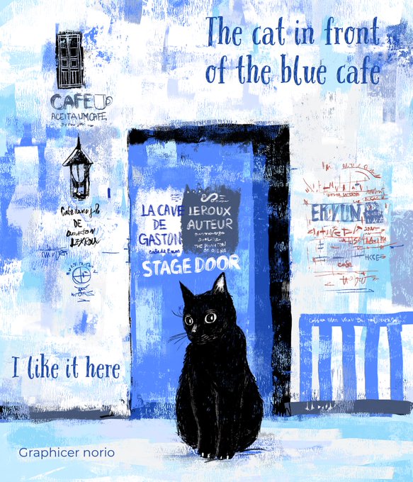 青いカフェが大好きな猫 お気に入りのドアの前 #illustraion #drawing #illustrationart #picturebook #cat #catlover #catstagram #CatsOnTwitter #猫好き #SEVENTEENinSEOUL #絵本