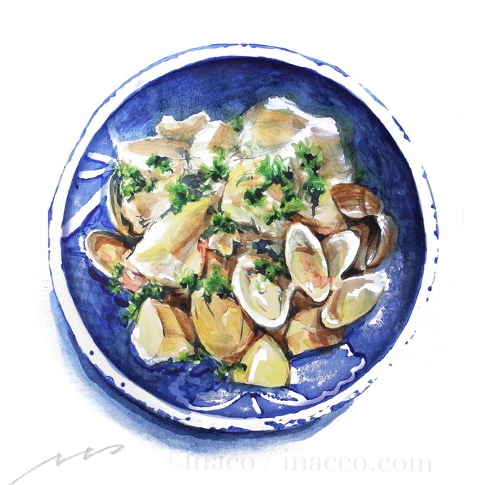 遠い昔に描いたポルトガル料理のアレンテージョ。印判にお料理盛ったシリーズは今でもたまに褒めていただけるので残してますが、私としては荒くてお恥ずかしい(^^;; #watercolor #watercolorpainting #watercolorfood #foodpainting #foodillustration #illustratedfood #透明水彩