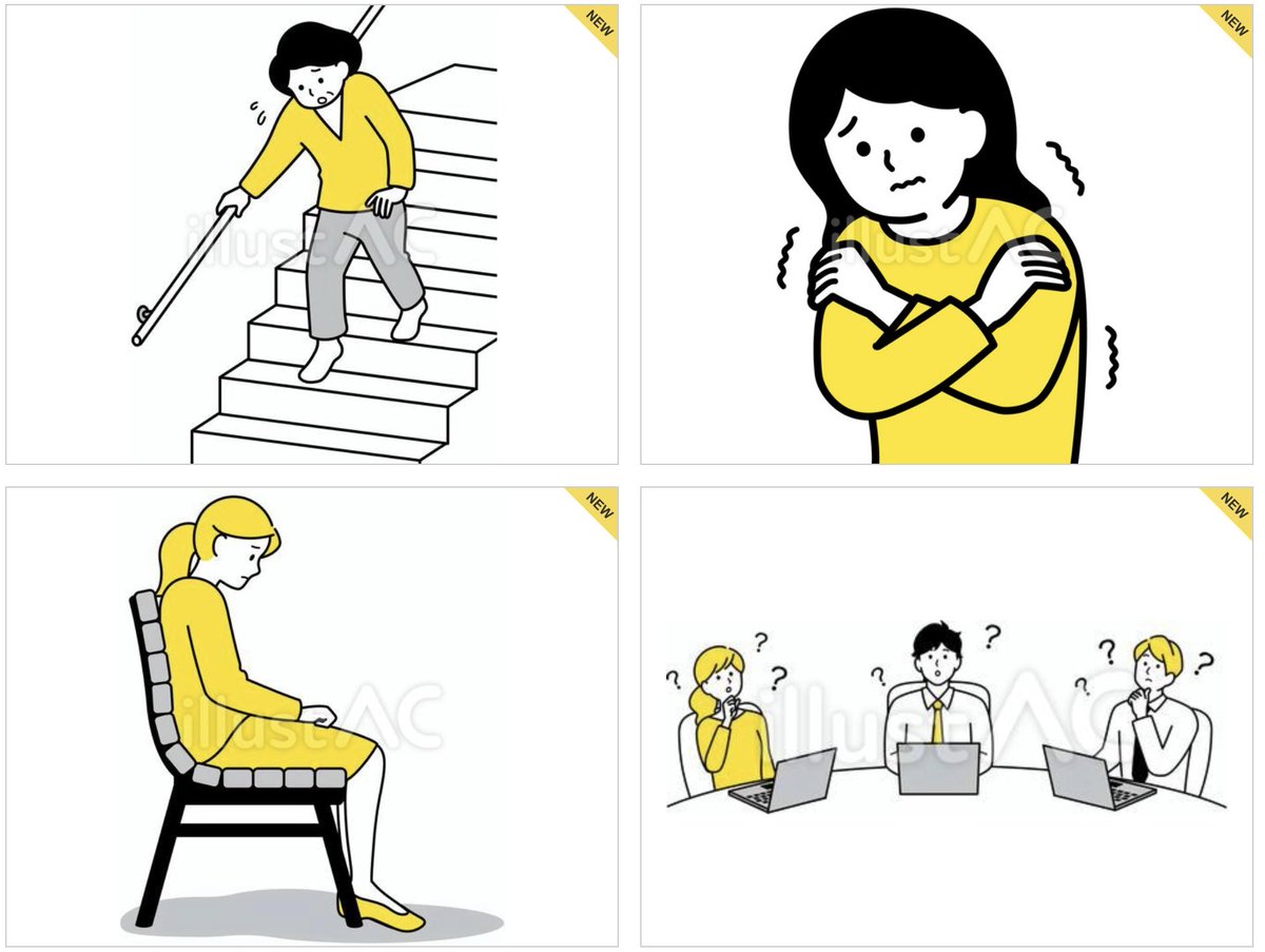 イラストACへ追加しました。 黄色、青、カラーの3種類です(AIデータ・jpeg・png) ・階段を降りるのが困難に感じている女性 ・ガタガタ震える女性 ・ベンチで悩むビジネス系男女 ・疑問に感じる男女 パソコン ac-illust.com/main/profile.p… #イラストAC #フリーイラスト #フリー素材 #illustrator素材