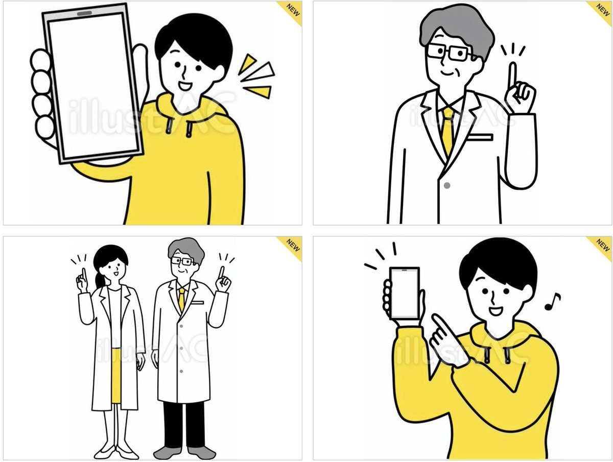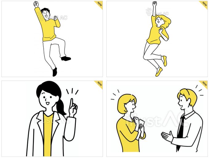 イラストACへ追加しました。 黄色、青、カラーの3種類です(AIデータ・jpeg・png) ・飛び跳ねて喜ぶ人 男女 ジャンプ ・説明する医師 女医さん 白衣 ・対面で話す男女 ・スマホ画面を見せる男性 ・・・など ac-illust.com/main/profile.p… #イラストAC #フリーイラスト #フリー素材 #illustrator素材