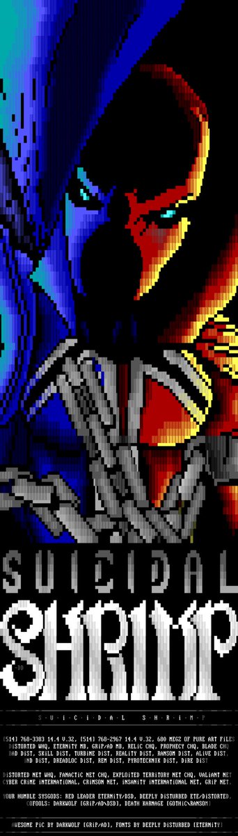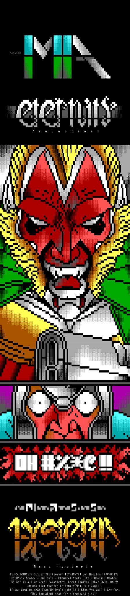 Mass Hysteria —- ANSI by Maestro // Eternity (1994) #ansiart #ansi #ascii #asciiart #pixelart #textmode #textart #text #art #demoscene #bbs #retrocomputing #retrographics #8bit #8bitart #graffiti #graffitiart #imagecomics #image30thanniversary #comics #comicbookart #bloodwulf