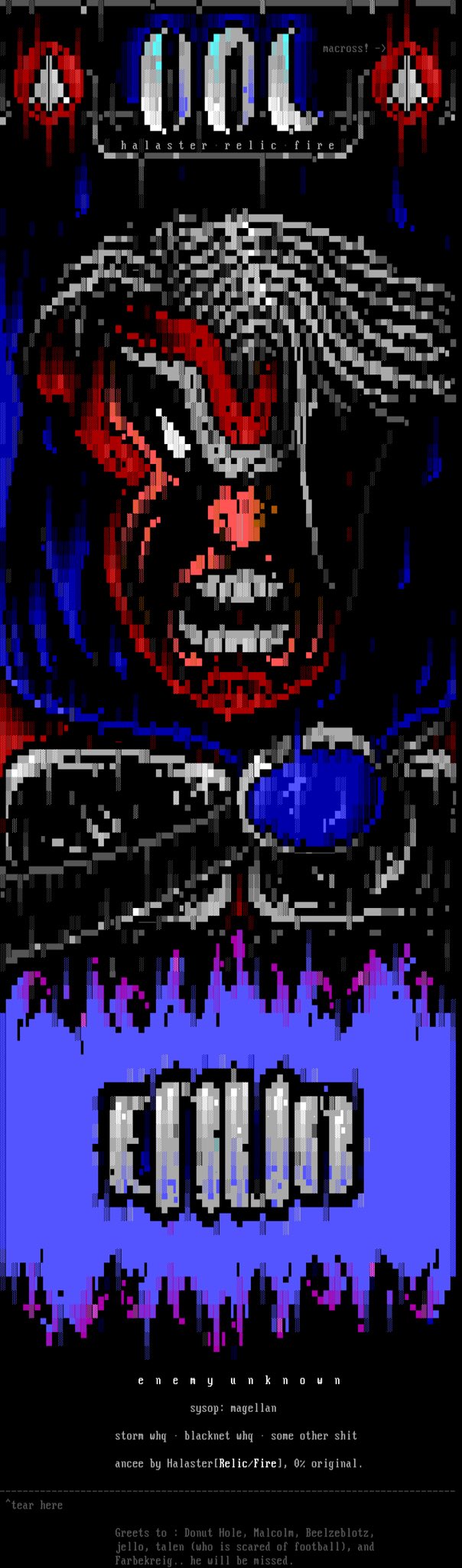 Enemy Unknown —- Union ANSI by Halster // Relic/Fire (1994) #ansiart #ansi #ascii #asciiart #pixelart #textmode #textart #text #art #demoscene #bbs #retrocomputing #retrographics #typography #graffiti #graffitiart #imagecomics #image30thanniversary #comics #comicbookart #union